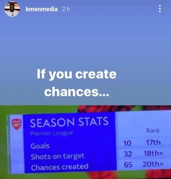 欧巴米安经纪人发来的这张Ins图显示了这样一组数据:本赛季阿森纳10球(联盟排名第17),32投命中目标范围(联盟排名第18),创造65次机会(联盟排名第20)。并写道:“如果你创造更多的机会……”