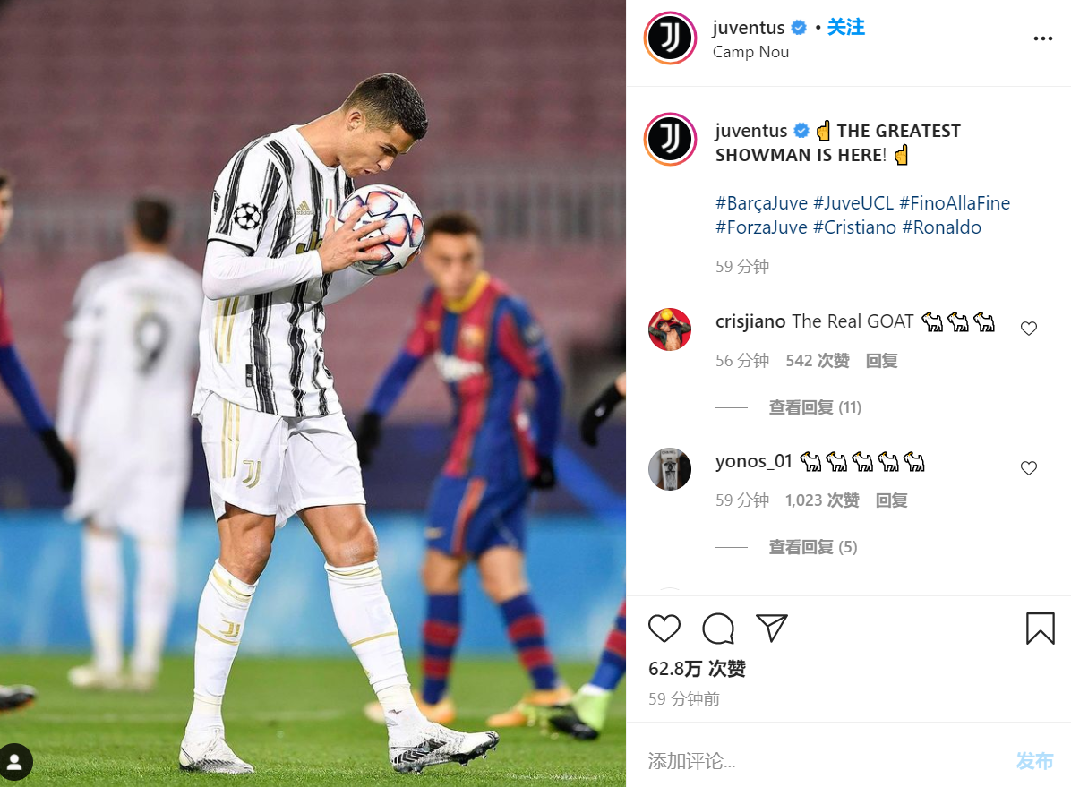 赛后,尤文正式发布了这样一款Ins。Ins发布的图片中,尤文图斯球星c罗持球,尤文图斯官方Ins短文写道:“最伟大的球员来了!”