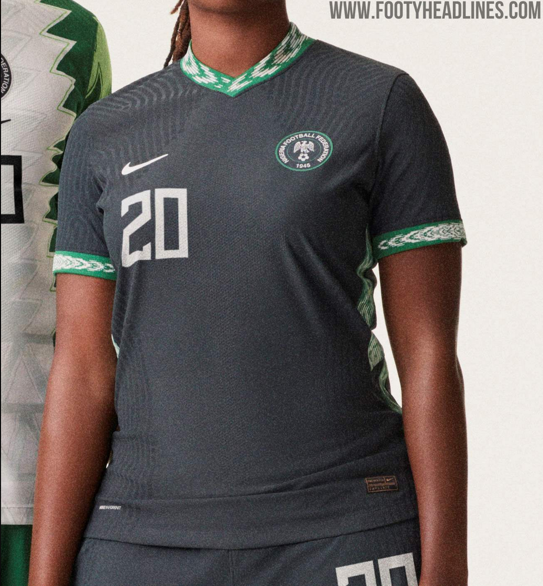 客场球衣主色调为灰色,并在领口袖口处添加了绿白色的羽毛图案,肩部亦有之字形竖条,灵感也来自尼日利亚当地艺术。