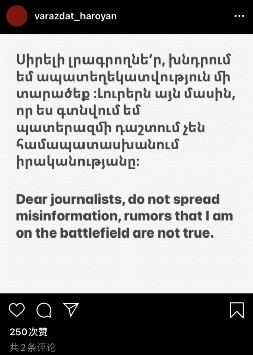 哈罗扬在自己的INS上表示:亲爱的记者们,请不要再传播错误信息,关于我在战场的传闻不是真的。我现在人在俄罗斯,但我会尽快飞回亚美尼亚,与其他亚美尼亚人一样,我会通过各种渠道支持我的国家。我和亚美尼亚国家队地其他成员将会成立基金会来满足部分士兵的需求。现在每一个亚美尼亚人必须支持我们的祖国,克服这个最艰难的时期,让这个时期尽快结束。”
