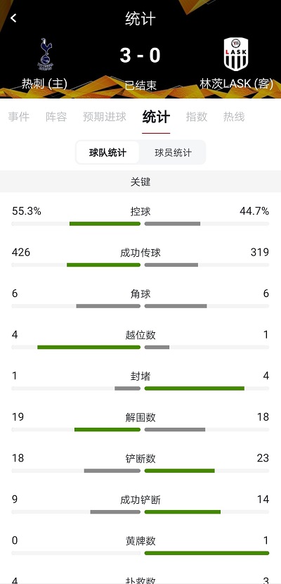 数据方面两队相差不多,热刺控球率稍占优势,成功传球次数也之比林茨LASK多了100次,两队角球数也是相同。