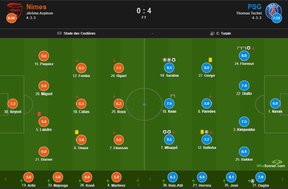 赛后评分方面,两传一射的萨拉维亚和梅开二度的姆巴佩获得最高的9.5分,尼姆的门将雷奈获得全队最高的7.2分。