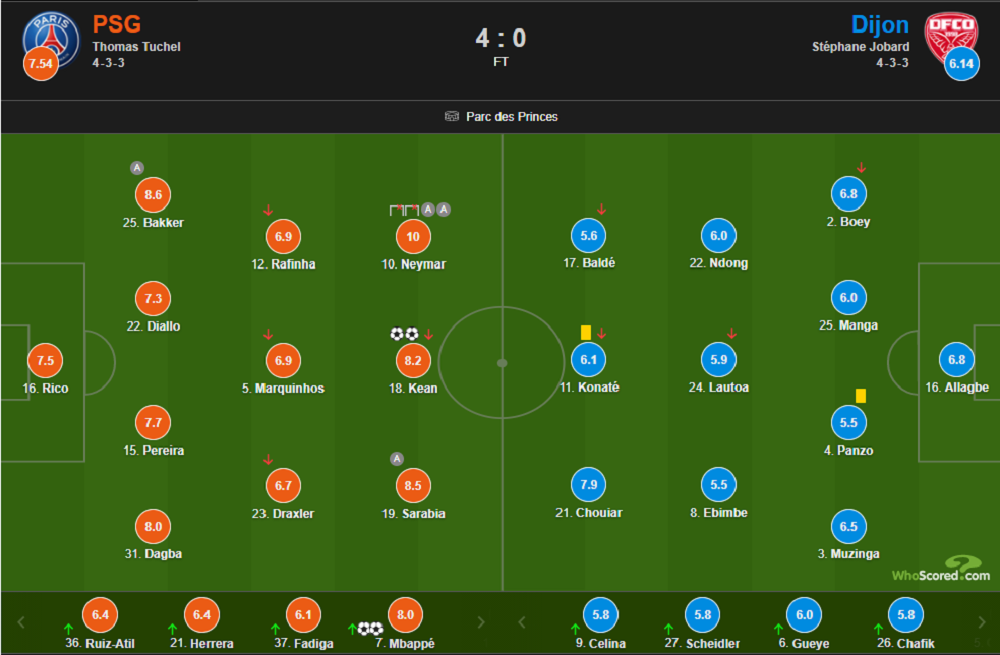 赛后评分方面,送出两次助攻的内马尔得到满分10分,贝克得到8.6分紧随其后,梅开二度的小基恩和姆巴佩分别得到8.2分和8.0分。第戎方面,科伊亚尔得到全队最高的7.9分。