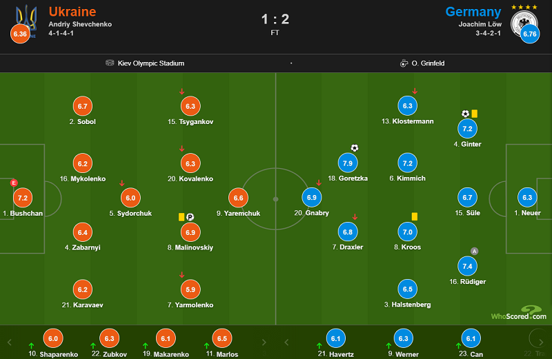 评分方面,戈雷茨卡以7.9的评分收获全场比赛最高评分,吕迪格与金特尔紧随其后;乌克兰方面,门将布舒查恩收获全队比赛最高评分。