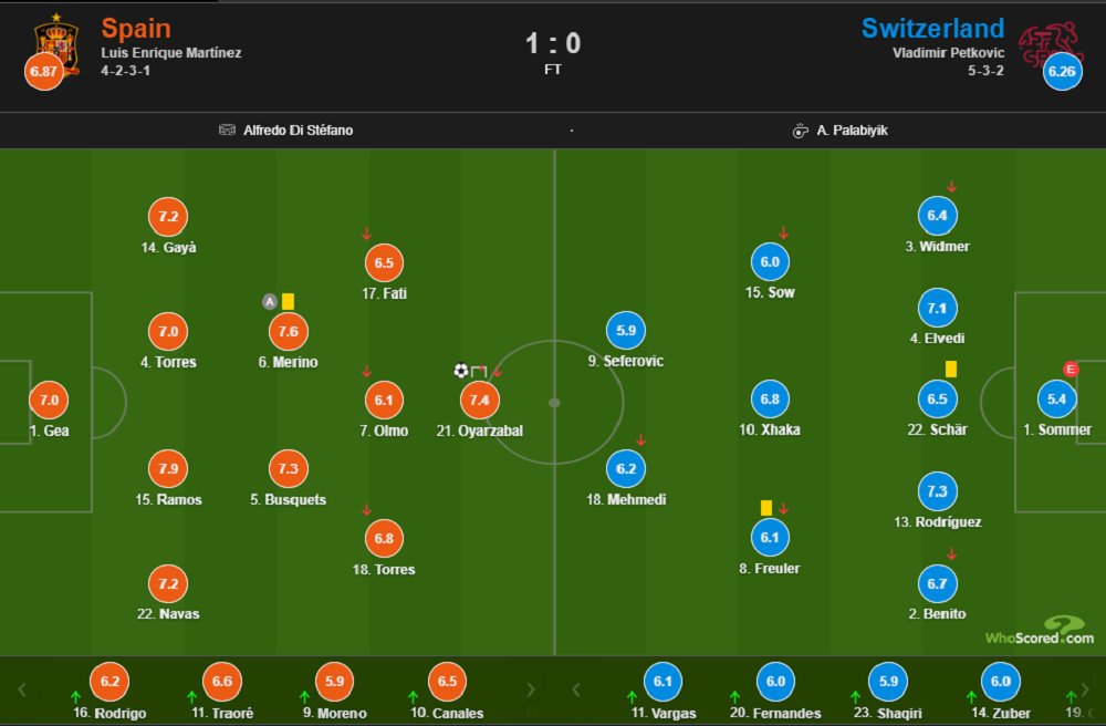 评分方面,西班牙后防表现稳健的拉莫斯得到本场比赛最高的7.9分,送出助攻的梅里诺紧随其后得到7.6分。瑞士方面,R-罗德里格斯得到球队最高的7.3分。