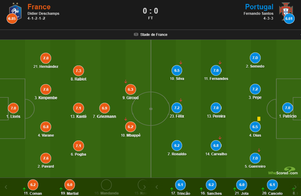 赛后评分方面,法国队后防表现出色的帕瓦尔和金庞贝得到最高的7.6分,葡萄牙方面,费利克斯和佩佩并列获得全队最高的7.2分。