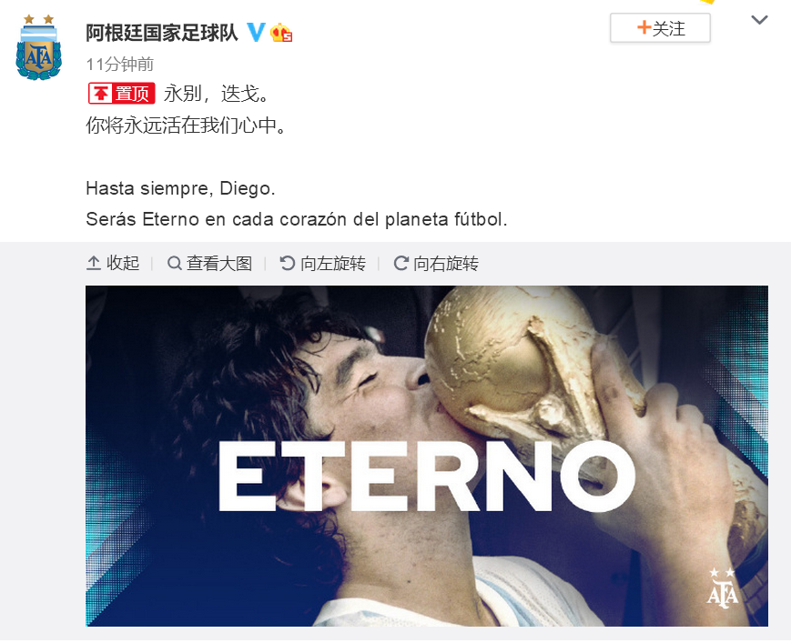 随后阿根廷国家队官方在中文微博也发文纪念,证实了这位阿根廷历史上最伟大球星的离世。“永别,迭戈。你将永远活在我们心中。”