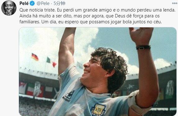 球王贝利也发文悼念:“我失去了一个好朋友,世界失去了一个传奇。我希望未来有一天我们能在天上一起踢球。”