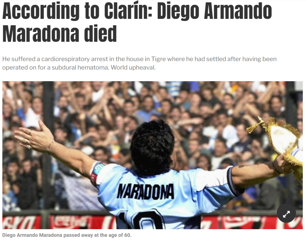 据报道,当地时间11月25日中午12点50分(北京时间25日23点50分),马拉多纳在家中突然失去意识,心脏骤停。虽然当时马拉多纳家附近有多辆救护车待命,医生也第一时间介入进行抢救,但最终在阿根廷当地时间11月25日中午13点02分,马拉多纳因抢救无效去世。《奥莱报》表示,“没有任何办法再挽救迭戈的生命”。