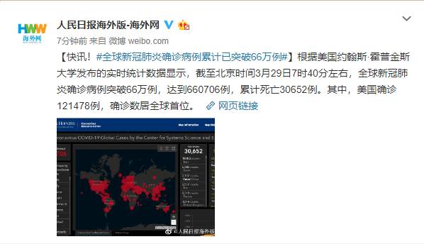 《人民日报》海外网消息,根据美国约翰·霍普金斯大学发布的实时统计数据,截至北京时间3月29日7时40分,全球新发冠状动脉肺炎确诊病例超过66万例,达到66.0706万例,累计死亡30652例。其中,美国确诊病例为121,478例,居世界首位。