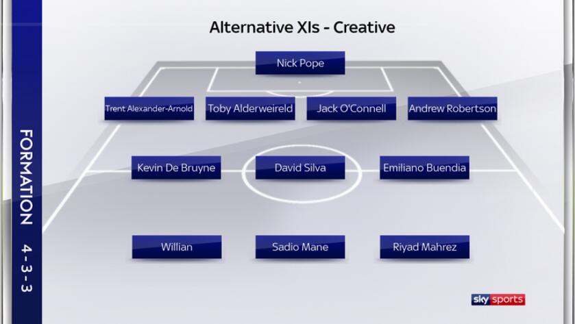 中场:德布劳内(曼城)、大卫-席尔瓦(曼城)、布恩迪亚(诺维奇)